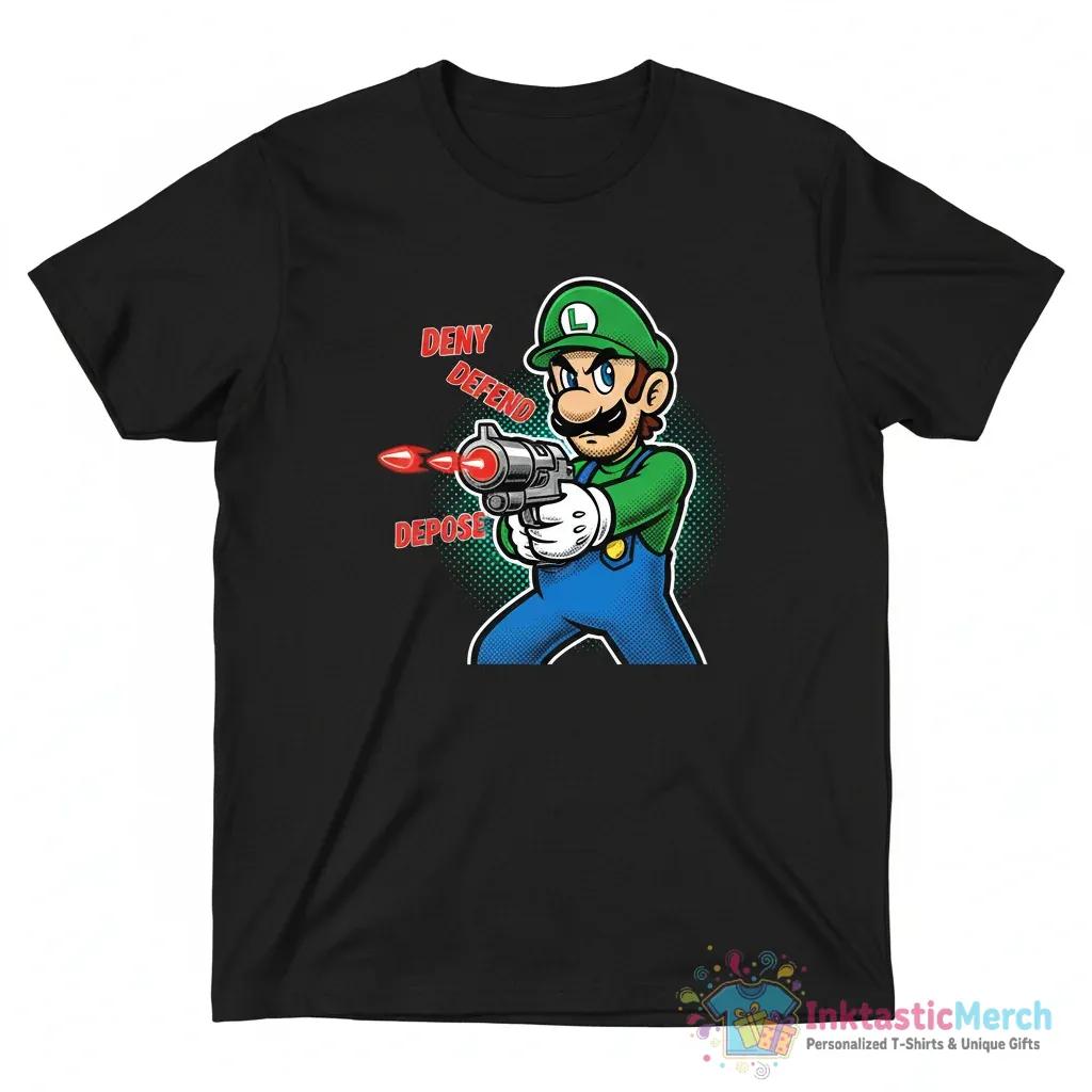 Bring your style to life with the Deny Defend Depose Luigi holding gun shirt today!