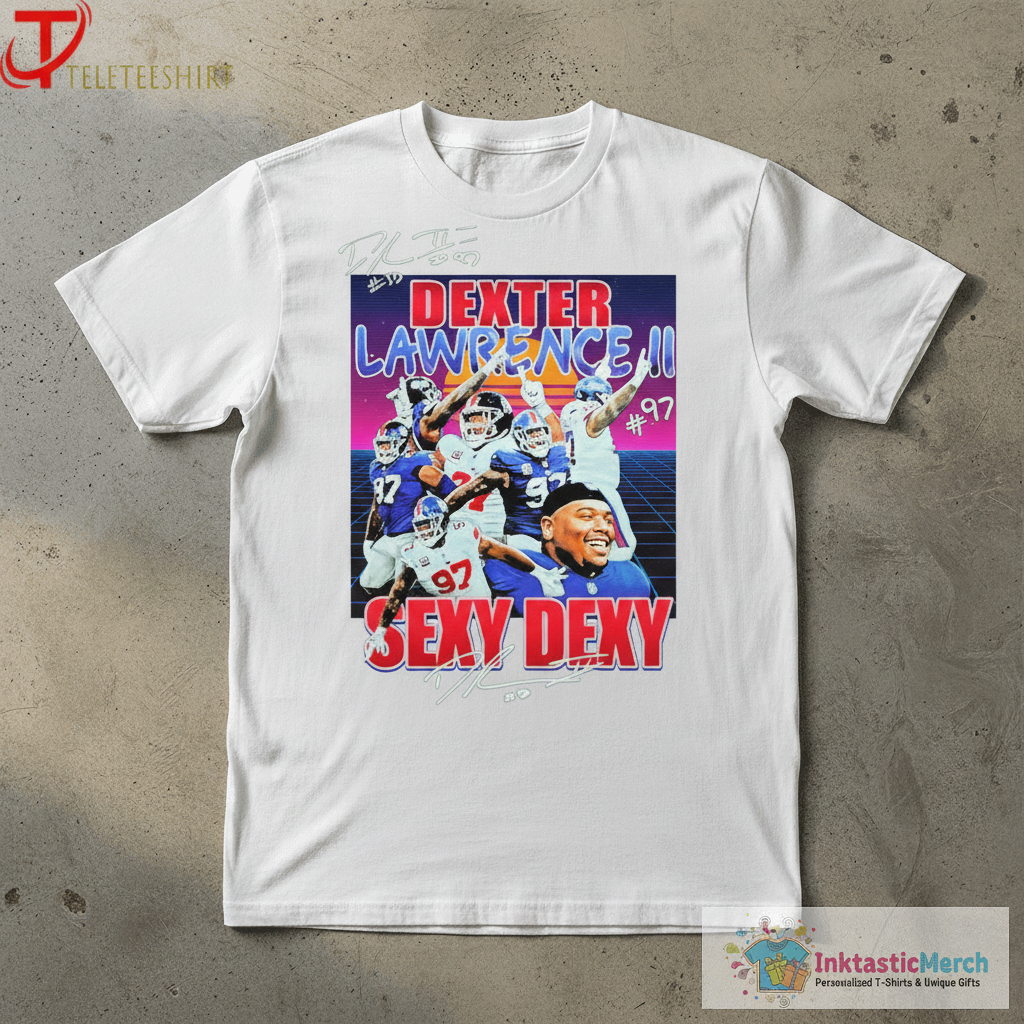 Show your team spirit with this Dexter Lawrence II Sexy Dexy #97 New York Giants T-shirt, celebrating a star player with an iconic #97. Made from super soft and comfortable, high-quality fabric built to last, this tee is perfect for true fans wanting to represent their favorite team and player with pride and comfort, discover more at InktasticMerch.