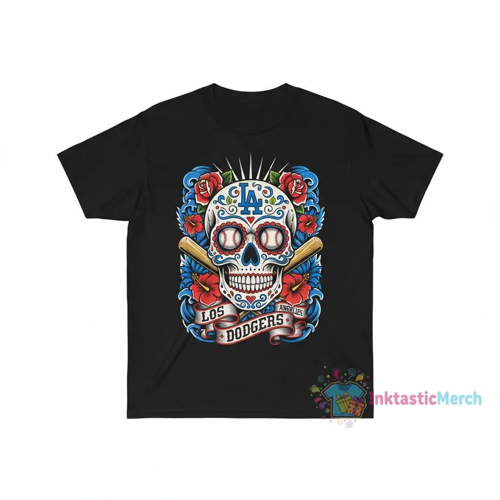 - Unique candy skull tattoo-inspired Dodgers graphic.