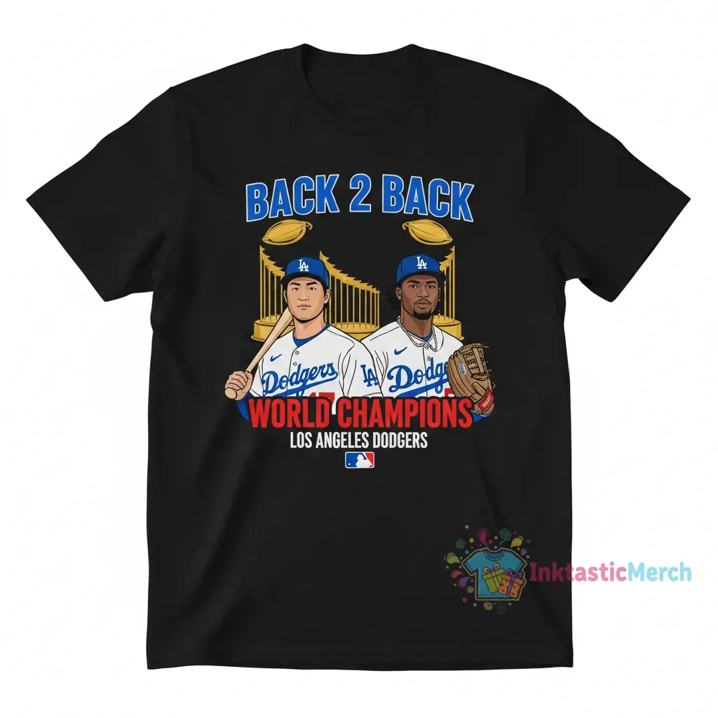 Celebrate the legendary duo of Shohei Ohtani and Mookie Betts with our exclusive Dodgers ‘Back2Back’ World Champions Shirt from InktasticMerch. Crafted from premium, pre-shrunk 100% cotton, this tee offers unparalleled comfort and a perfect fit that lasts, wash after wash. Showcase your unwavering support and own a piece of Dodgers history with this vibrant, eco-friendly ink design.