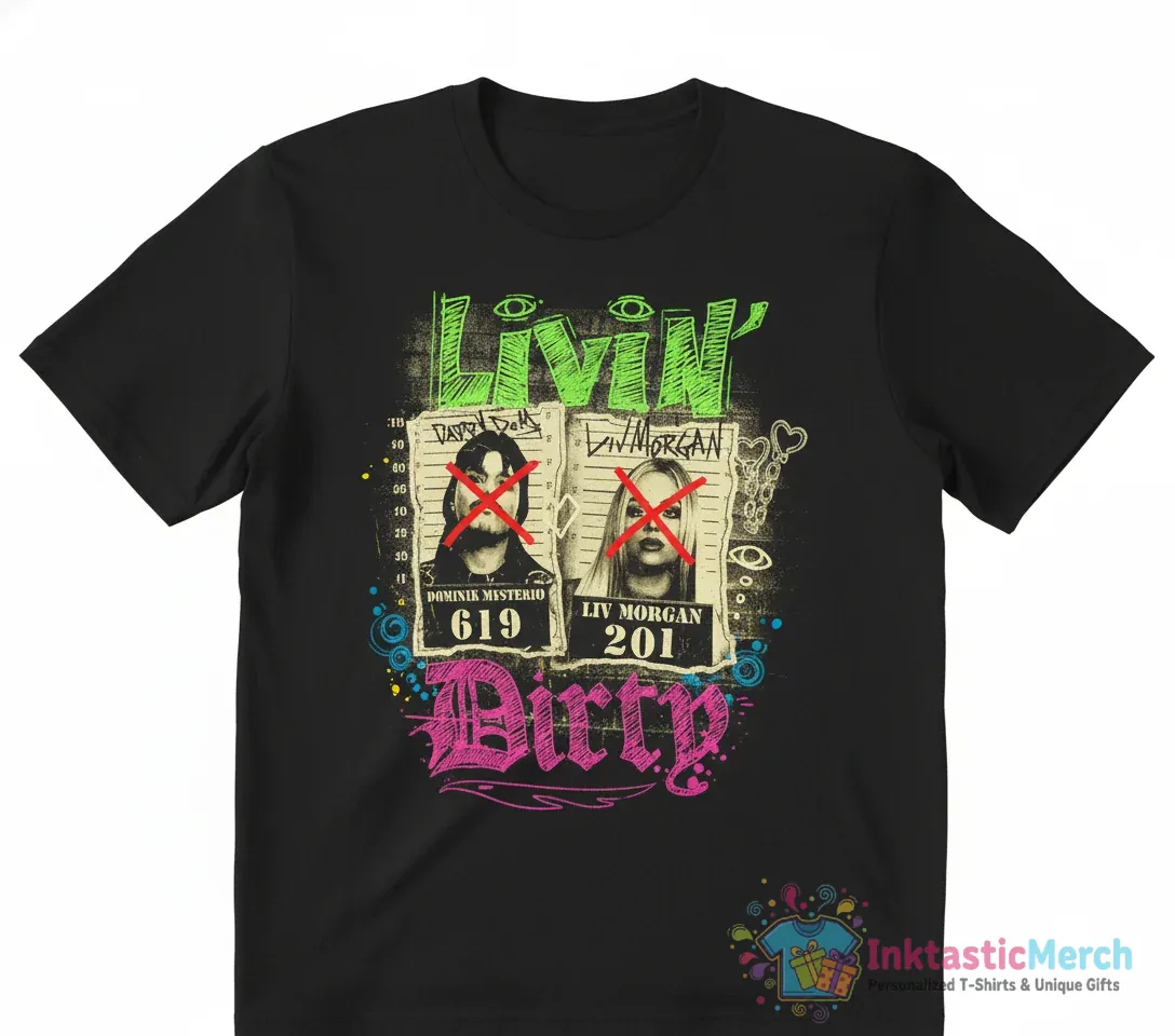 Show your passion for wrestling drama with the Dominik Mysterio and Liv Morgan Livin’ Dirty mugshot shirt, a unique statement piece designed for comfort and style. Made with ultra-soft, premium fabric and featuring a durable print, this shirt from InktasticMerch offers exceptional quality and a great feel, perfect for everyday wear.