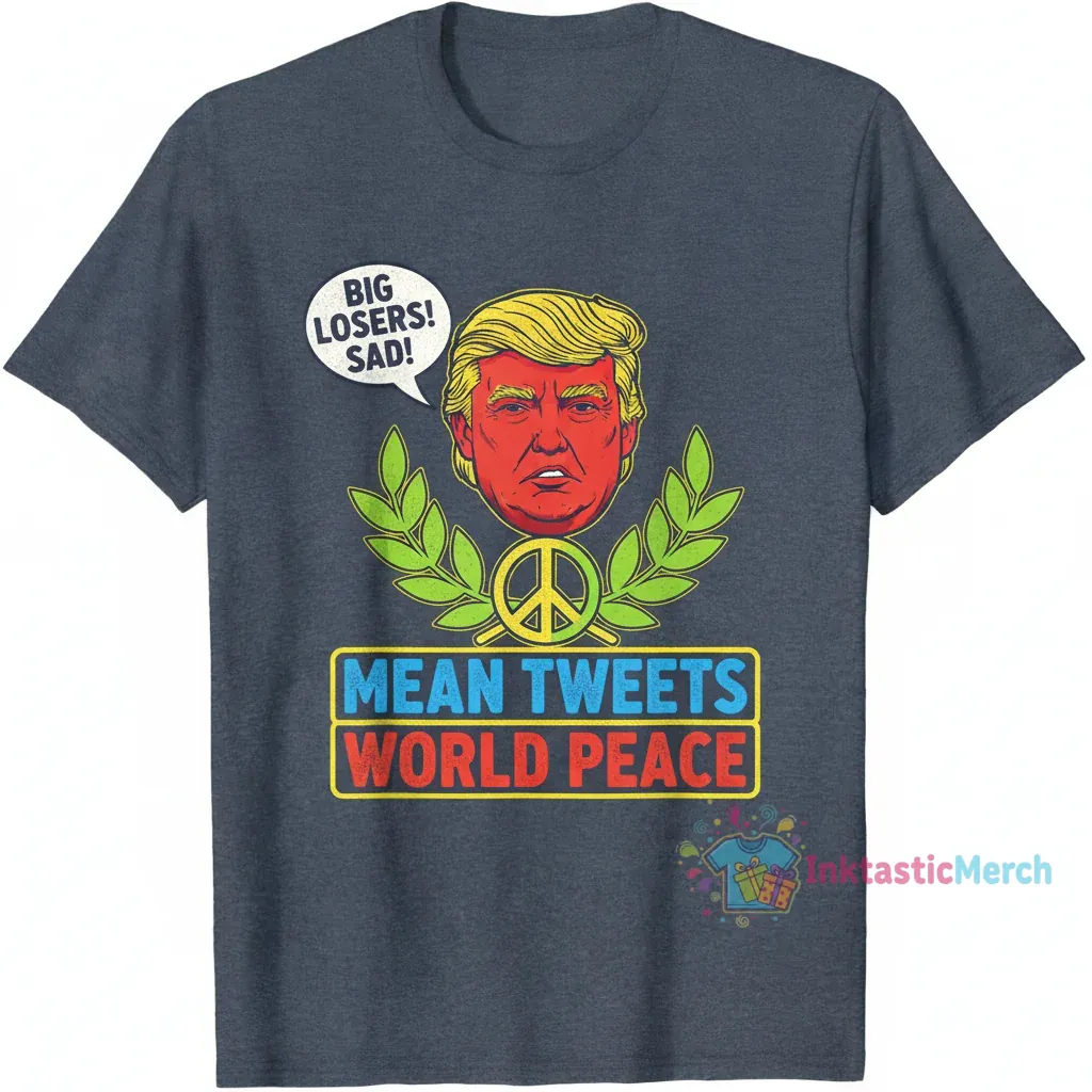 Make a statement with the Donald Trump Mean Tweets World Peace Shirt, designed for comfort and durability. Crafted from a premium quality cotton blend, this tee offers exceptional softness and a vibrant, long-lasting print. Express your unique sense of humor and political viewpoint with this conversation starter, available from inktasticmerch.com.