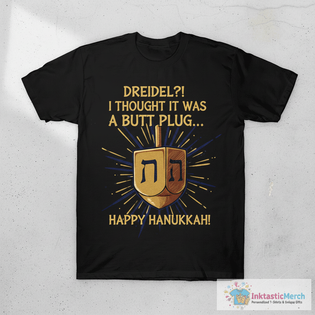 Make a hilarious statement this Hanukkah with the “Dreidel I Thought That Was A Butt Plug. Uh…Happy Hanukkah!” T-shirt from InktasticMerch. This tee is designed for maximum comfort and lasting style, crafted from incredibly soft, high-quality material that holds its shape and vibrant print wash after wash. Its relaxed, unisex fit makes it a comfortable and flattering choice for everyone, perfect for adding a fun, lighthearted vibe to any occasion.