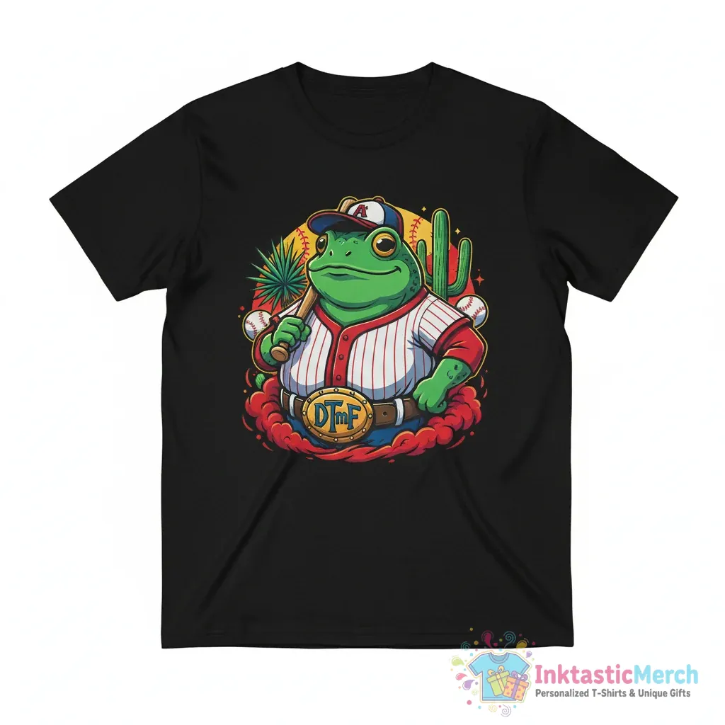 Show off your unique style with the DTmF Concho baseball frog shirt. This eye-catching tee features a cool concho and baseball-inspired frog design, perfect for anyone who loves a bit of quirky fashion. Made from super soft, premium fabric, it feels amazing against your skin. Whether you’re heading out with friends or just relaxing at home, this shirt is sure to become a favorite. It’s designed for a comfortable, unisex fit that looks great on everyone. Add a touch of fun to your wardrobe with this must-have graphic tee.