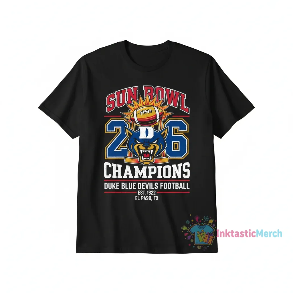 Duke Blue Devils ’26 Sun Bowl Champions, this shirt is more than just apparel; it’s a wearable testament to grit, glory, and unforgettable moments. We wanted to capture the electrifying spirit of victory and the pride of being a Blue Devil. Our original artwork tells the story of that triumphant Sun Bowl season, a celebration of dedication and teamwork that resonates long after the final whistle. It’s a piece of history you can wear, a reminder of the passion that fuels champions.