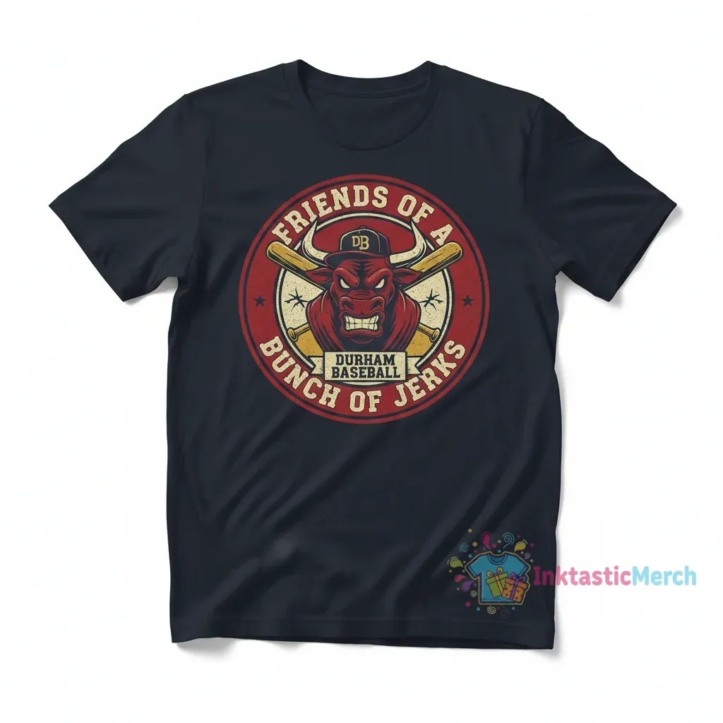 Fans of the Durham Bulls, lovers of classic baseball movies, group outings, casual wear, birthdays, or just as a fun gift for your best buds. This shirt is ideal for anyone who enjoys a good laugh and great company. Bring your style to life with the Durham Bulls “Bunch of Jerks” Friends T-Shirt today!