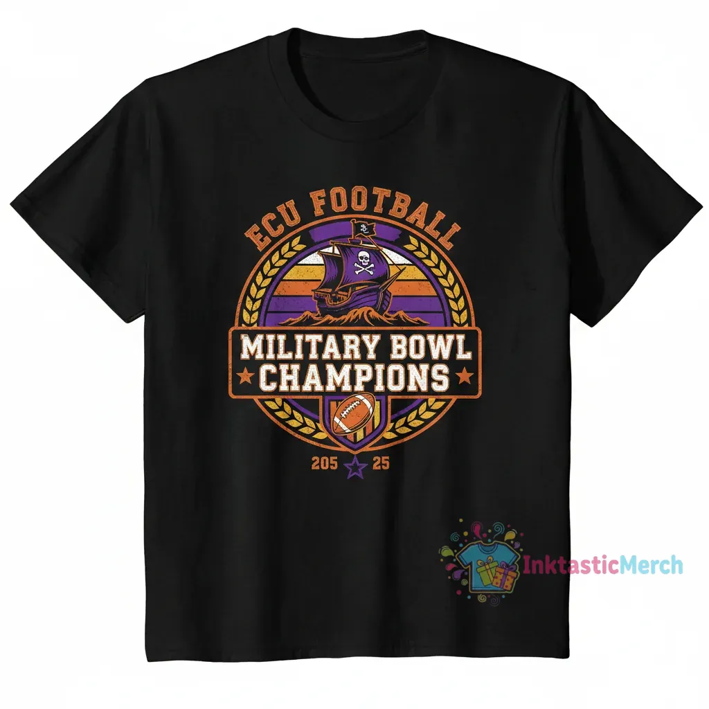 Celebrate the ECU Football team’s triumphant victory as NCAA Military Bowl Champions 2025 with this exclusive commemorative T-shirt from inktasticmerch.com. Crafted from 100% ring-spun cotton, this high-quality apparel offers unparalleled softness and breathability, ensuring maximum comfort and lasting wear for dedicated fans. Its durable construction and premium features make it a must-have piece of fan memorabilia to showcase your team spirit.