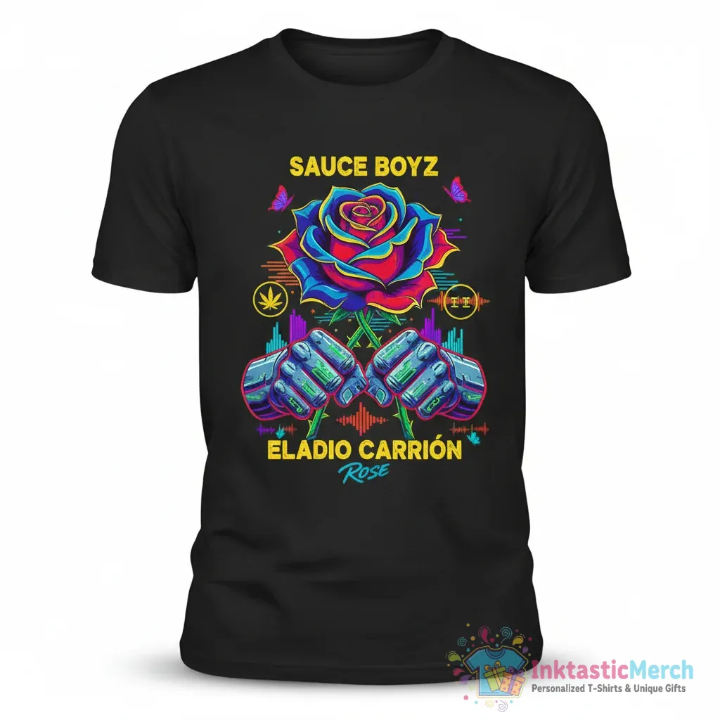 Show your appreciation for Eladio Carrion with this premium Eladio Carrion Sauce Boyz Rose T-shirt from InktasticMerch. Crafted from a soft, premium cotton blend, this tee offers exceptional comfort and durability, featuring vibrant, exclusive artwork that captures the artist’s essence, making it a perfect statement piece for any fan.