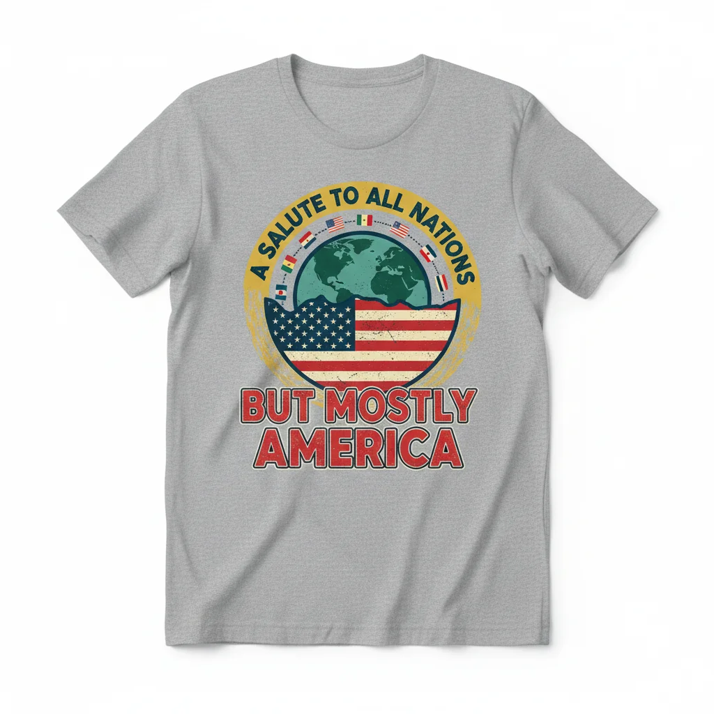 “A Salute to All Nations (But Mostly America)” is more than just a phrase; it’s a playful nod to our shared global spirit, with a touch of good-natured hometown pride. This original artwork was born from a desire to celebrate the rich tapestry of cultures that make our world vibrant and unique, while playfully acknowledging the special place many of us hold for our own roots. It’s a design meant to spark conversation, inspire connection, and bring a smile to faces, no matter where you call home. Wear it as a symbol of unity, with a wink and a smile.