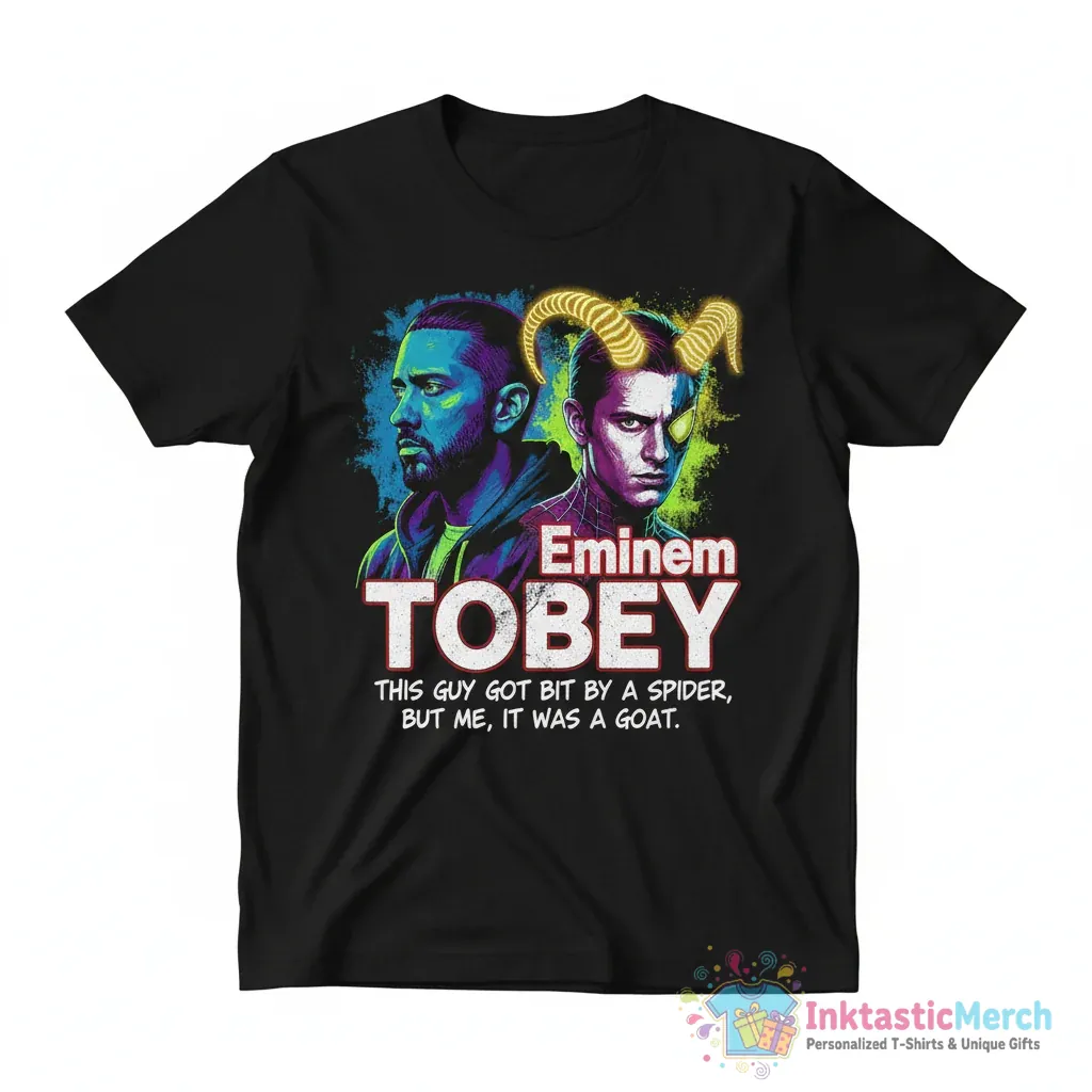 - Unique “Eminem Tobey This Guy Got Bit By a Spider But It Was a Goat” graphic print.