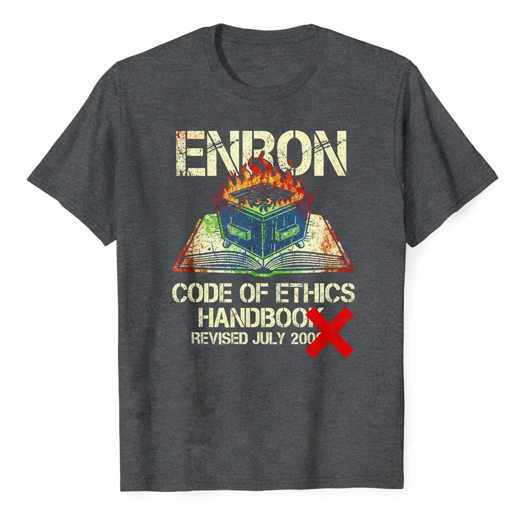 Showcase your ironic wit with the “ENRON – Code of Ethics handbook” Essential T-Shirt, a perfect piece of corporate satire. This graphic tee is a hilarious nod to one of history’s most infamous financial scandals, making it an ideal conversation starter. Designed for professionals, students, and history buffs, this shirt makes a bold statement in any setting. It’s wearable commentary, perfect for gifting to accountants, finance majors, or any coworker who appreciates a dark sense of humor.