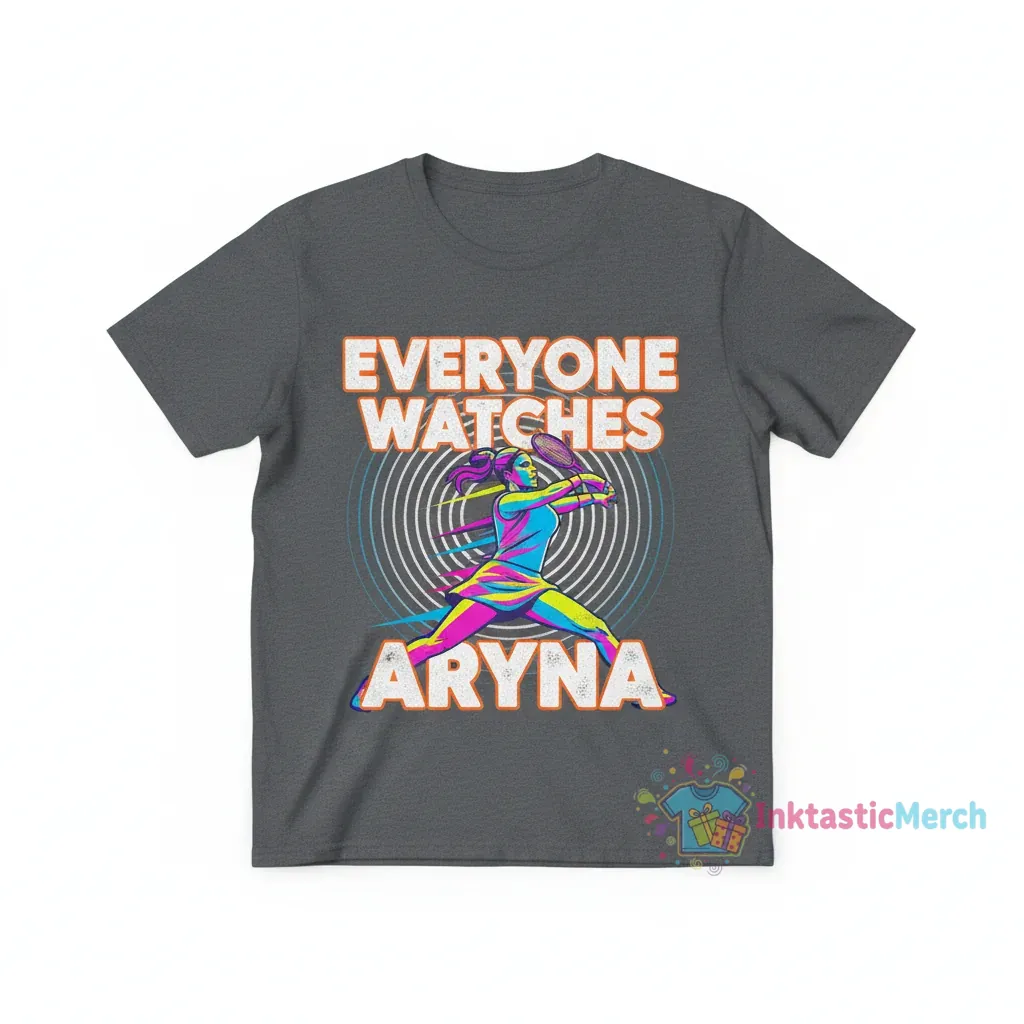 Celebrate your favorite personality with the **Everyone Watches Aryna T-Shirt**, a premium tee offering exceptional comfort and a modern look perfect for everyday wear or showing your support. Crafted from 100% ring-spun cotton and pre-shrunk for lasting quality, this shirt ensures a soft feel and a flattering fit, embodying the brand’s commitment to durability and style found at inktasticmerch.com.