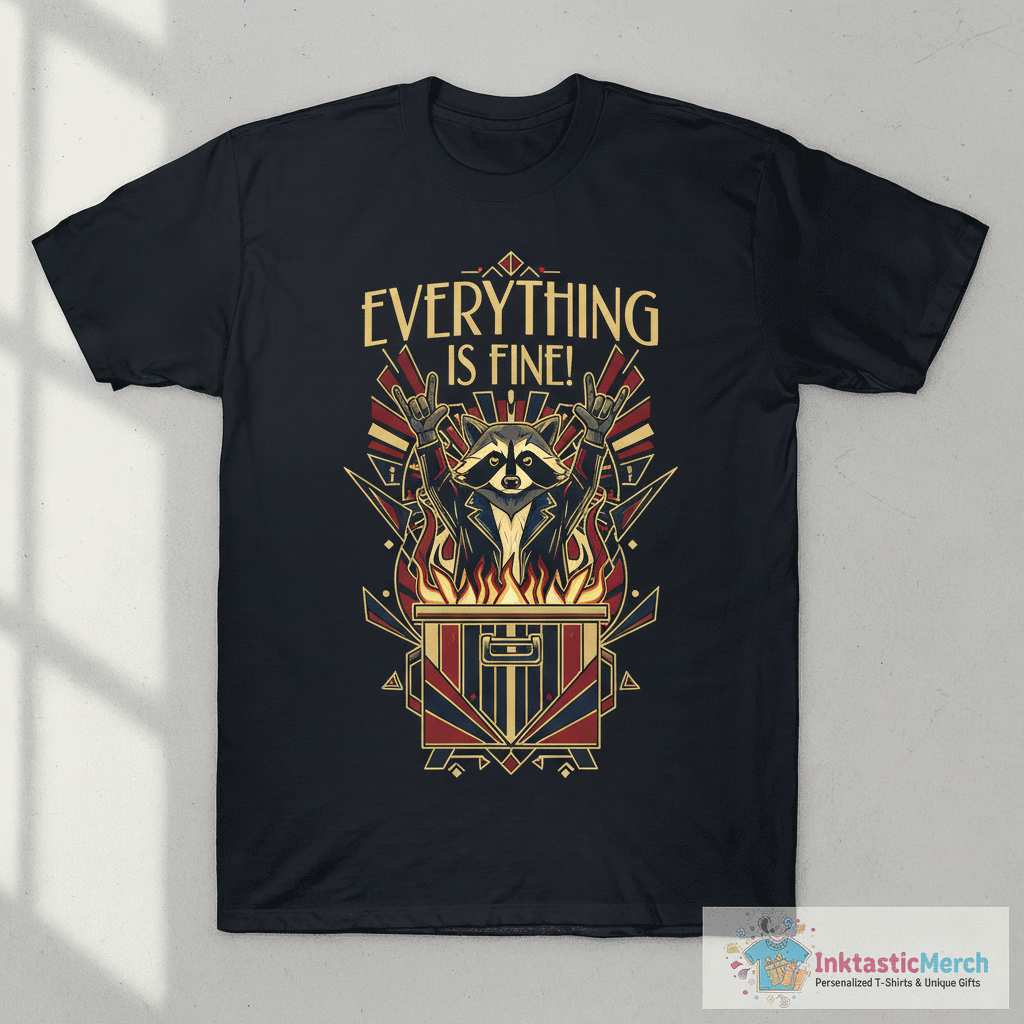 Embrace the chaos with the “Everything is fine raccoon dumpster fire” T-Shirt from InktasticMerch. Crafted from premium, ultra-soft cotton, this tee offers ultimate comfort and a durable fabric that holds its shape and color wash after wash. Its unique and funny raccoon dumpster fire graphic design makes it a statement piece, perfect for those who appreciate dark humor and want to show off their quirky side.