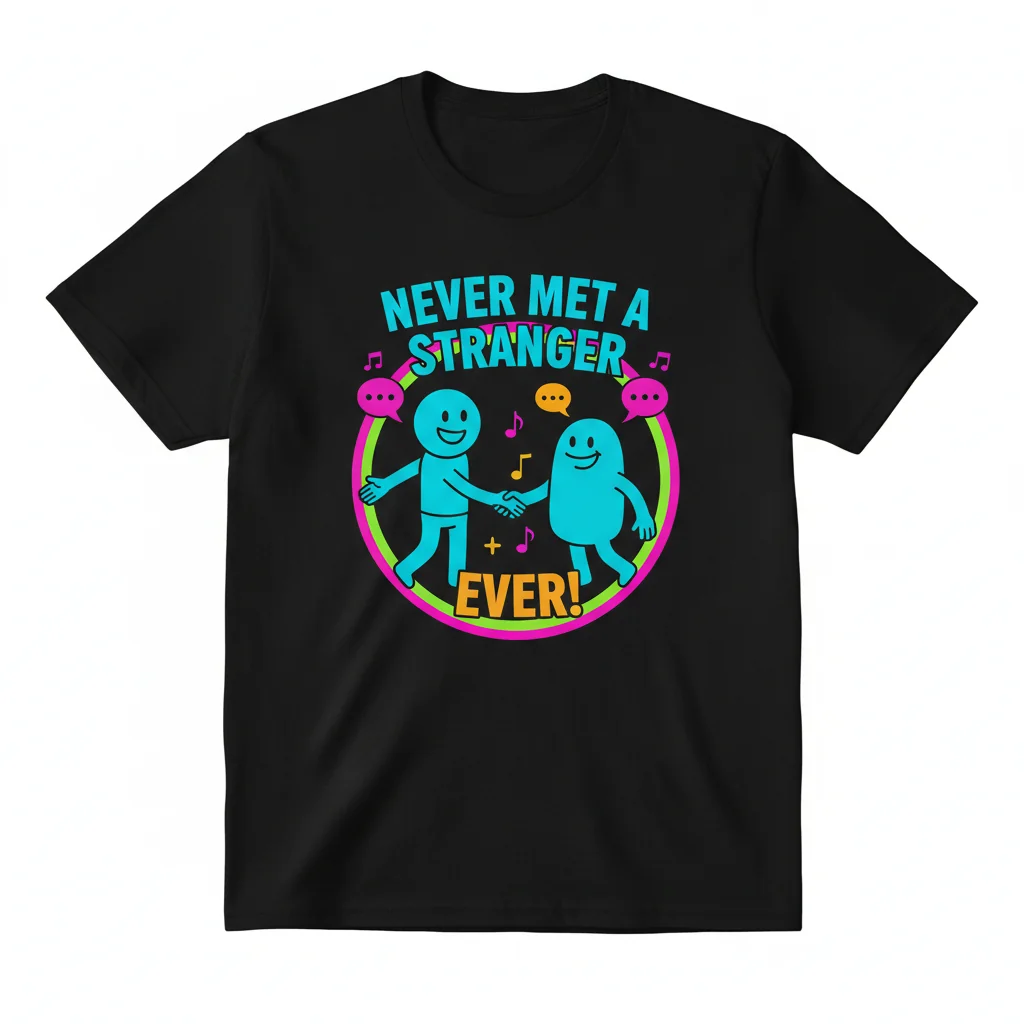 To maintain the vibrant print and premium quality of your “Never Met A Stranger, Ever! Extrovert Funny Quote” Essential T-Shirt, machine wash cold, inside-out, with like colors. Tumble dry low or hang-dry for best results. Avoid ironing directly on the design and do not bleach. This versatile tee is perfect for casual outings, social gatherings, expressing your personality at work, or as a fun and thoughtful gift for the extrovert in your life. Its comfortable fit and durable design make it an everyday staple for those who love to connect and share a laugh.