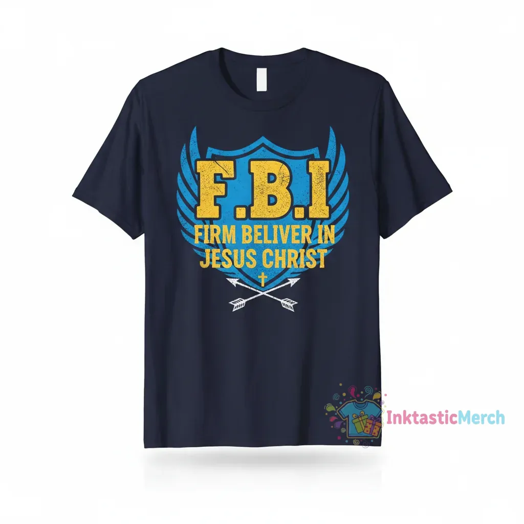 The FBI Firm Believer in Jesus T-Shirt, crafted from 100% ring-spun cotton, offers exceptional comfort and durability with its soft feel and breathable, pre-shrunk fabric. This tee provides a flattering retail fit and side-seamed construction for a better shape, embodying the quality you can expect from apparel found at inktasticmerch.com.