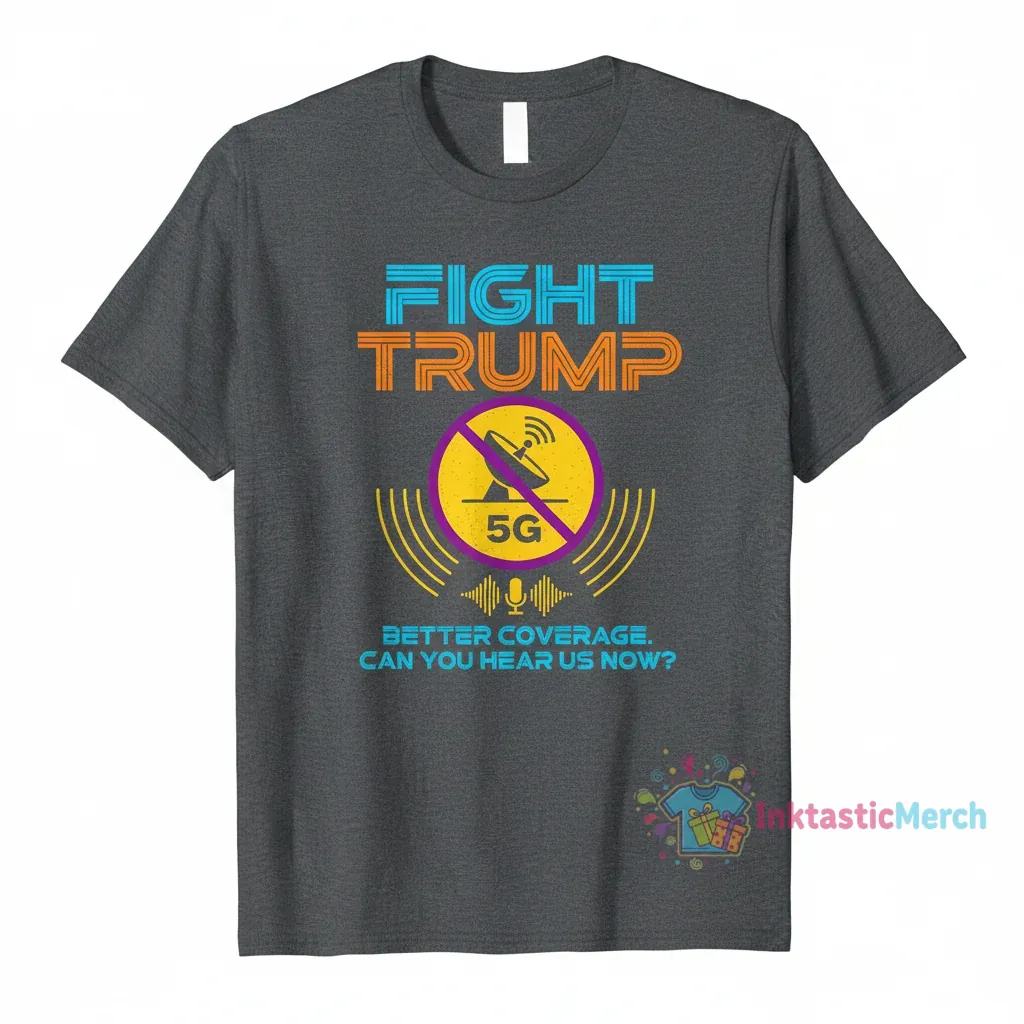 Express your political views with the ‘Fight Trump Better Coverage Than 5G Can You Hear Us Now Shirt’ from InktasticMerch. Crafted from 100% ring-spun cotton for superior softness and breathability, this pre-shrunk tee offers a modern retail fit that’s both comfortable and flattering. Its durable construction ensures the vibrant graphic remains clear through countless washes, making it a lasting addition to your wardrobe and a powerful conversation starter.