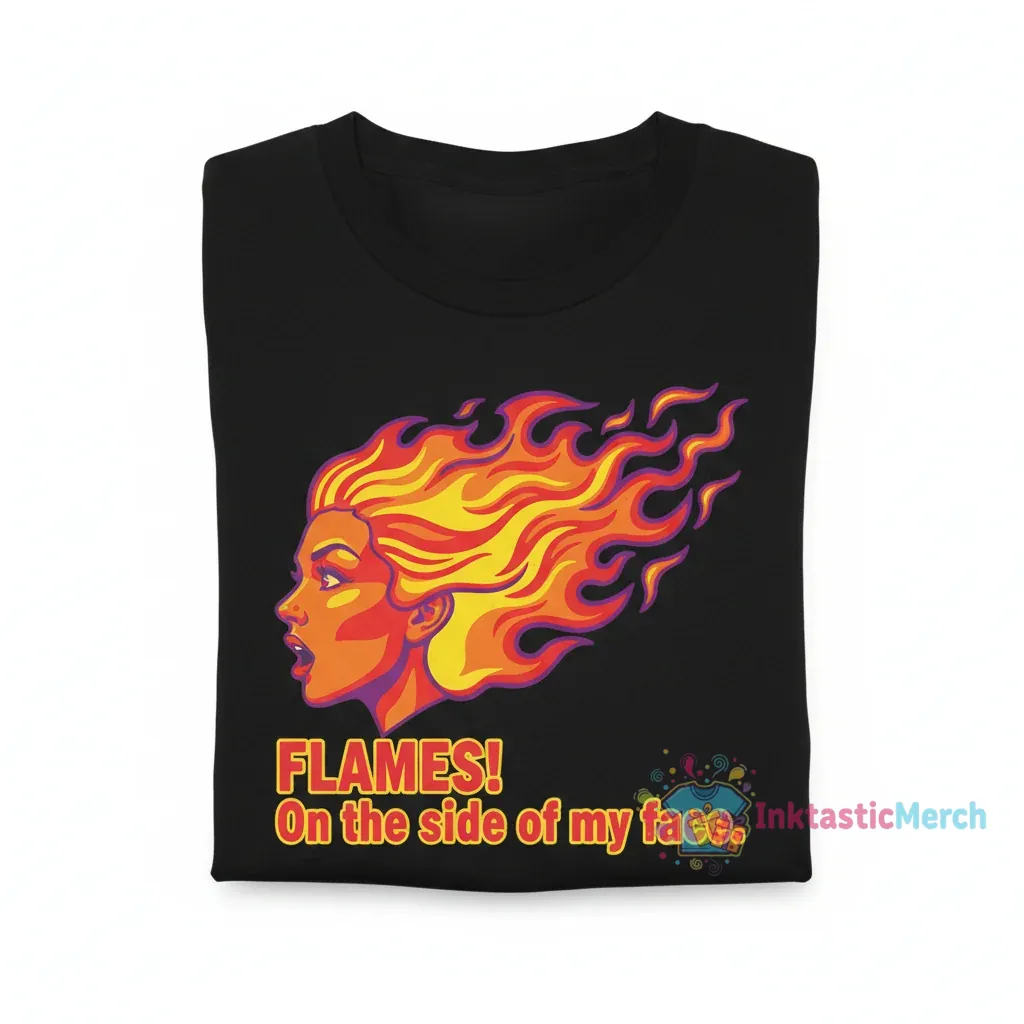 To maintain the quality and longevity of your “Flames! On the Side of My Face” t-shirt, machine wash cold, inside-out, with like colors. Tumble dry low or hang dry for best results. Avoid using bleach or ironing directly on the printed graphic. This versatile tee pairs effortlessly with jeans, shorts, or even layered under a jacket or cardigan, making it suitable for casual outings, movie nights, comic conventions, or simply lounging at home. Embrace your inner comedy fan with style and comfort.