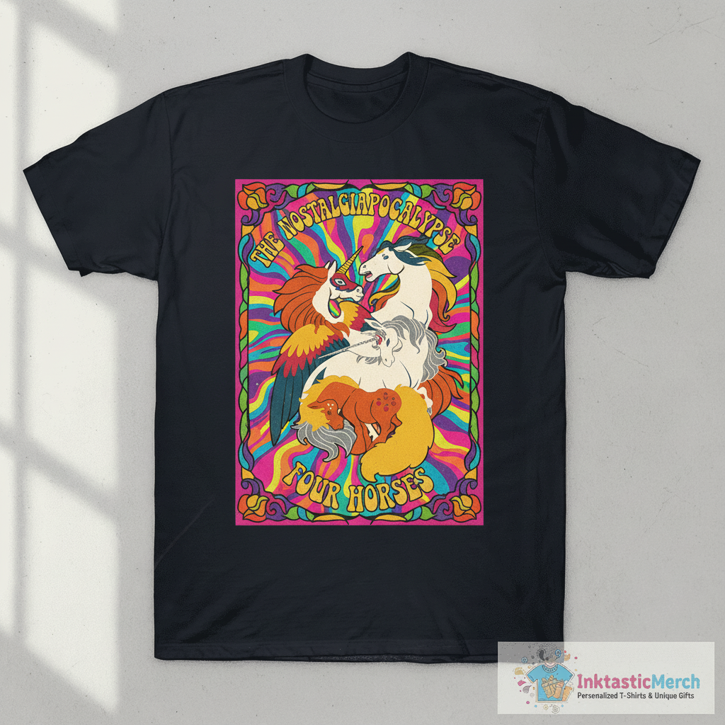 Unleash your inner myth with the Four Horses of the Nostalgialypse T-Shirt from InktasticMerch. Crafted for ultimate comfort with its super-soft fabric, this tee features vibrant and detailed artwork that blends fantasy with retro cool. It’s a statement piece designed to celebrate creativity and individuality, perfect for expressing your distinctive style.