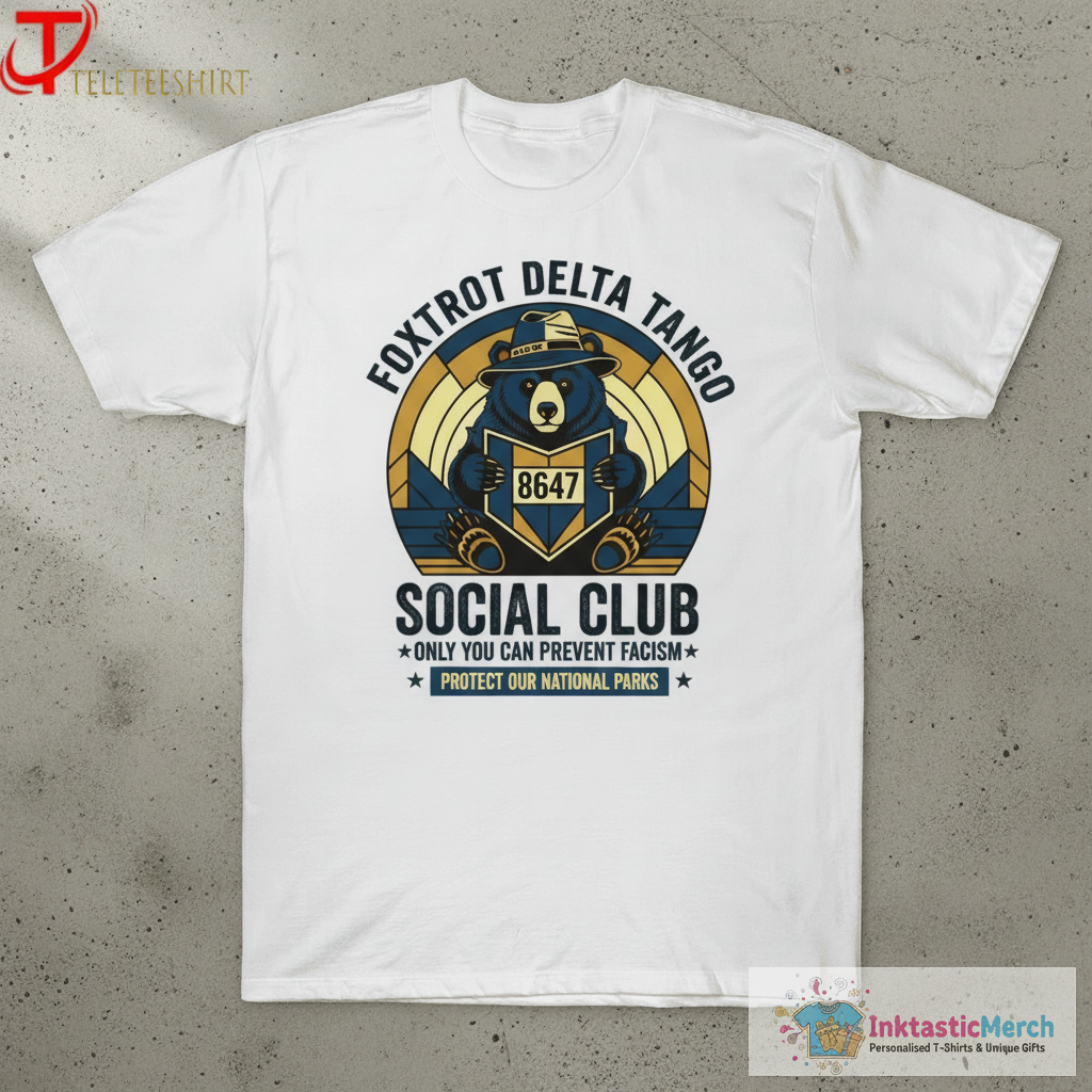 - Unique “Foxtrot Delta Tango Social Club Only You Can Prevent Fascism Protect Our National Parks” graphic for a standout look.