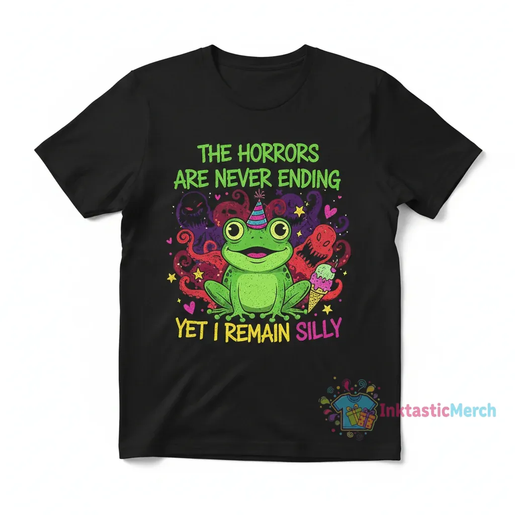 This ‘Frog The Horrors Are Never Ending Yet I Remain Silly’ T-shirt is a unique and humorous apparel item perfect for anyone who appreciates dark humor and a touch of whimsy. Designed for comfort and style, this tee features a bold statement that resonates with a resilient and lighthearted outlook on life’s challenges. It’s an ideal choice for casual wear, making a statement without sacrificing comfort, and is sure to be a conversation starter among friends and fellow enthusiasts of quirky graphic tees.