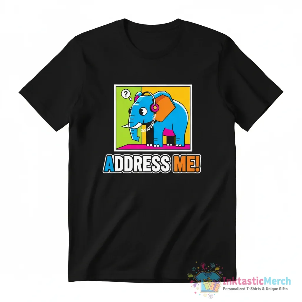 Make a statement with the Funny Address Me Elephant Meme In The Room T-shirt! This tee is perfect for anyone who loves a good laugh and wants to show off their unique sense of humor. Featuring a hilarious and relatable elephant meme, this shirt is sure to turn heads and spark conversations. Crafted for ultimate comfort and style, it’s the ideal addition to your casual wardrobe. Express yourself and embrace the fun with this eye-catching design!