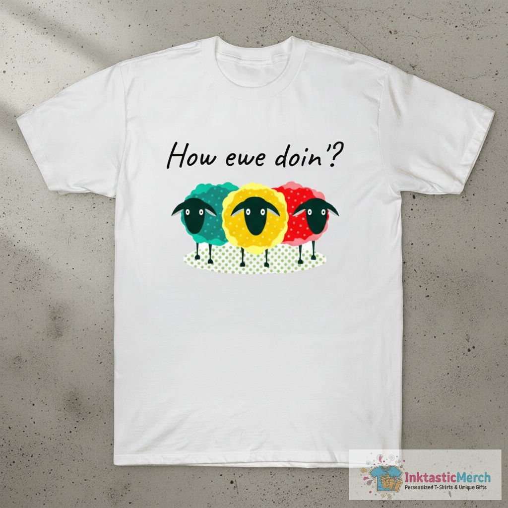 Bring your style to life with the Funny Punny How Ewe Doin’? T-shirt today!