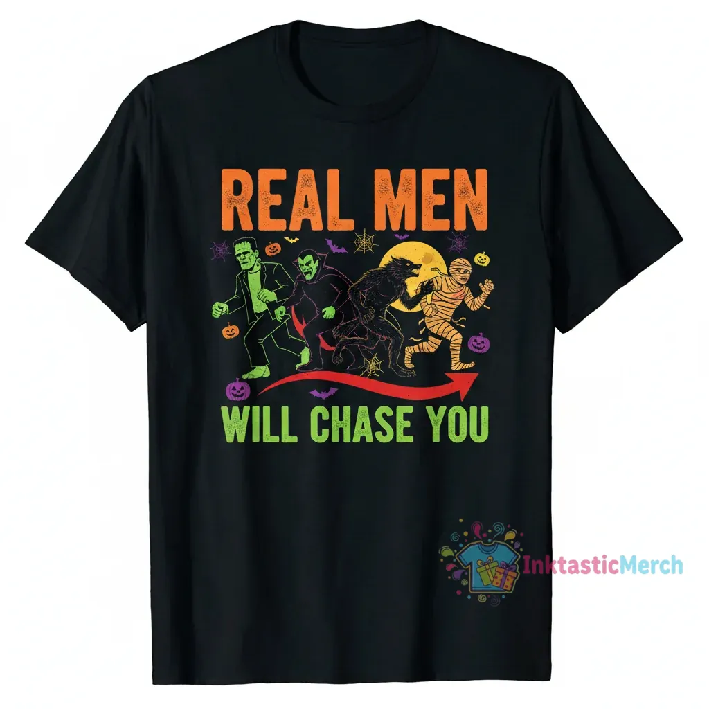 This ‘Real Men Will Chase You’ Halloween character t-shirt is crafted from 100% premium ring-spun cotton, ensuring a soft feel and excellent breathability, while the preshrunk fabric minimizes shrinkage. Designed with a modern retail fit for comfort and durability, this shirt is a humorous and eye-catching addition to any Halloween enthusiast’s wardrobe, available from inktasticmerch.com.