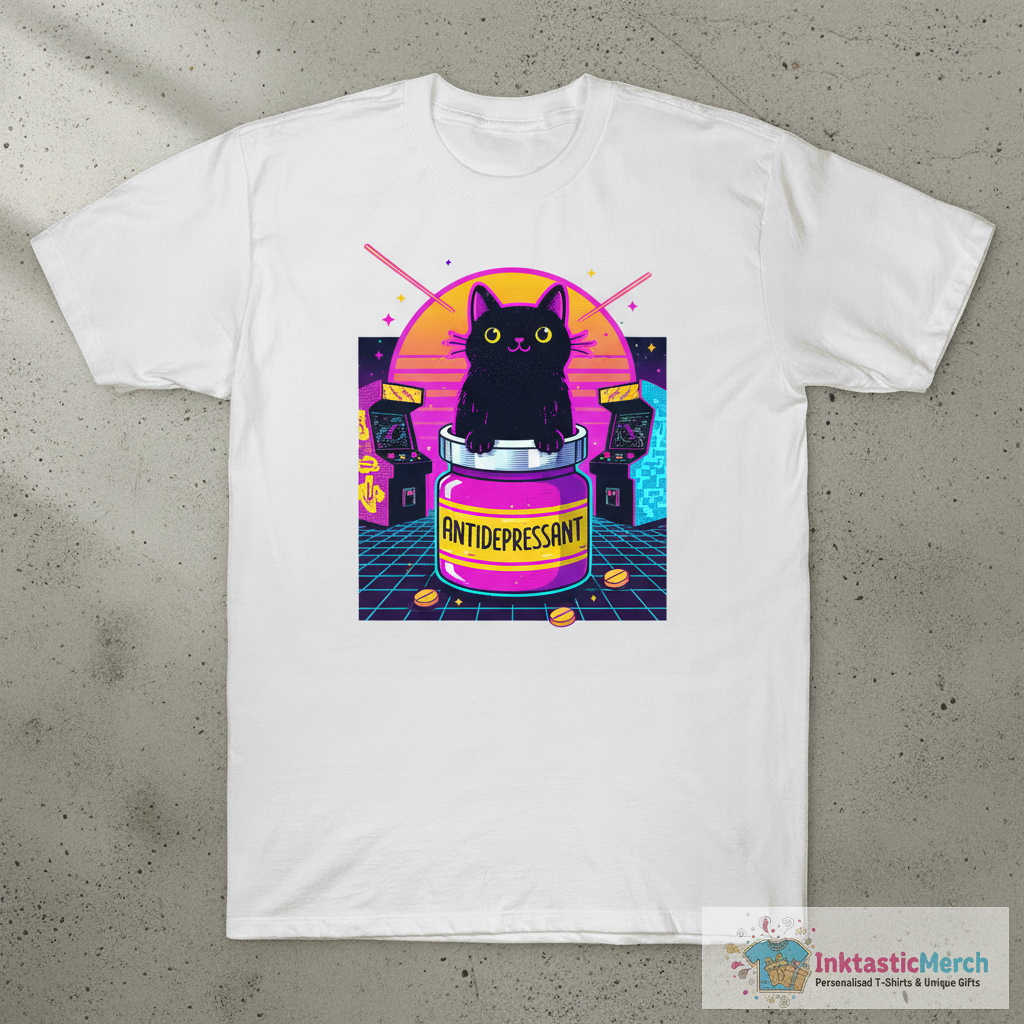 - Unique “Fur antidepressant” cat-themed graphic design.