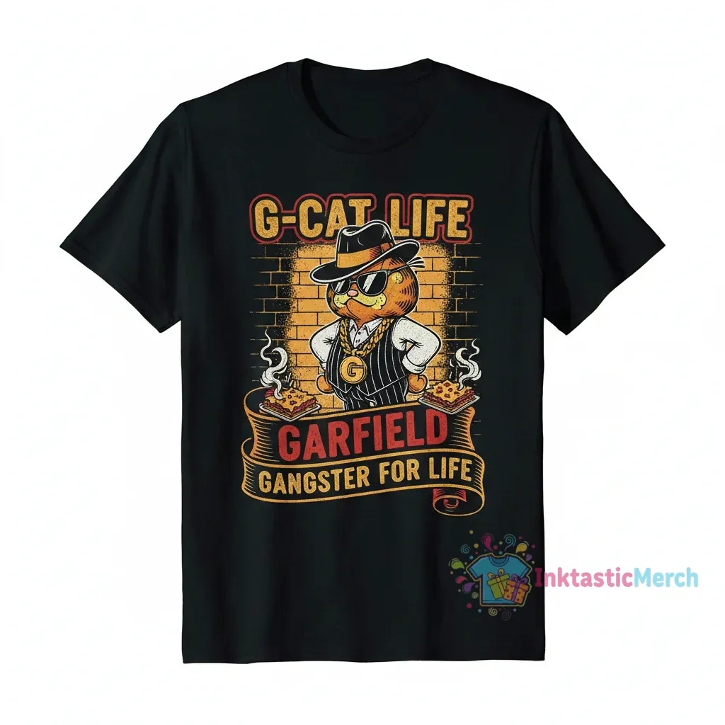 - Eye-catching graphic featuring a gangster-themed Garfield
