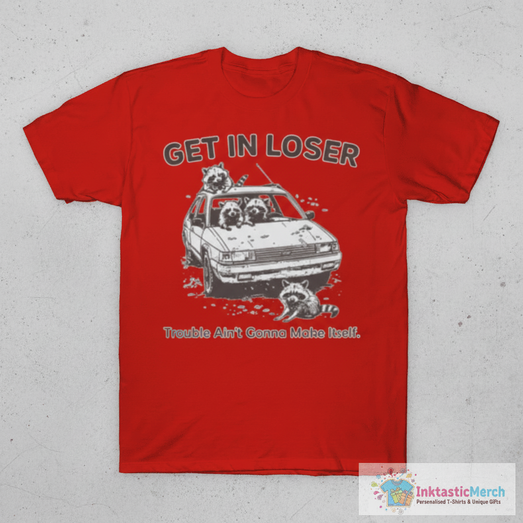 Get ready for some fun with the Get In Loser Trouble Ain’t Gonna Make Itself Raccoon T-Shirt! Crafted with high-quality fabric for ultimate comfort and durability, this tee is designed to be a statement piece showing off your playful side. Explore more unique designs at inktasticmerch.com.