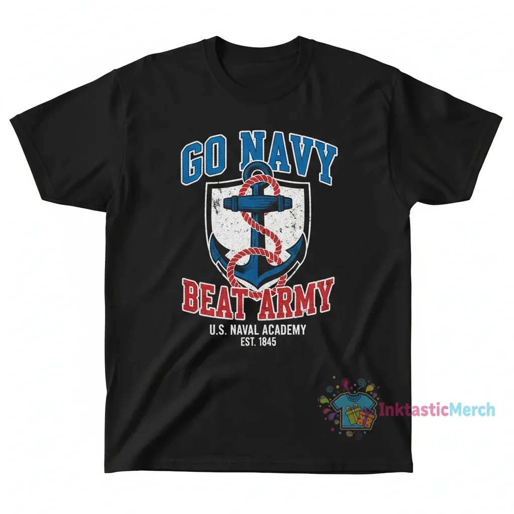 Show your unwavering support for the U.S. Naval Academy with the iconic “Go Navy Beat Army 1854” T-Shirt. This tee isn’t just apparel; it’s a statement of pride and tradition, celebrating the enduring spirit of Annapolis and the legendary rivalry. Perfect for game days, alumni events, or everyday wear, this shirt lets you carry the Naval Academy spirit wherever you go.