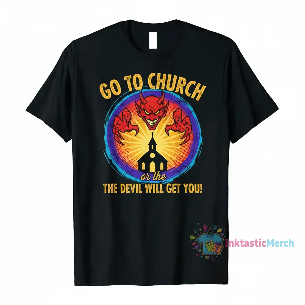 To preserve the quality and vibrant print of your “Go to Church or the Devil Will Get You!” t-shirt, machine wash cold with like colors and tumble dry low. Avoid ironing directly on the graphic. This versatile black tee can be styled in numerous ways. Wear it on its own for a casual statement, layer it under a jacket or hoodie for added warmth and style, or pair it with jeans, shorts, or even casual trousers. It’s perfect for everyday wear, social gatherings, or expressing your personal beliefs.