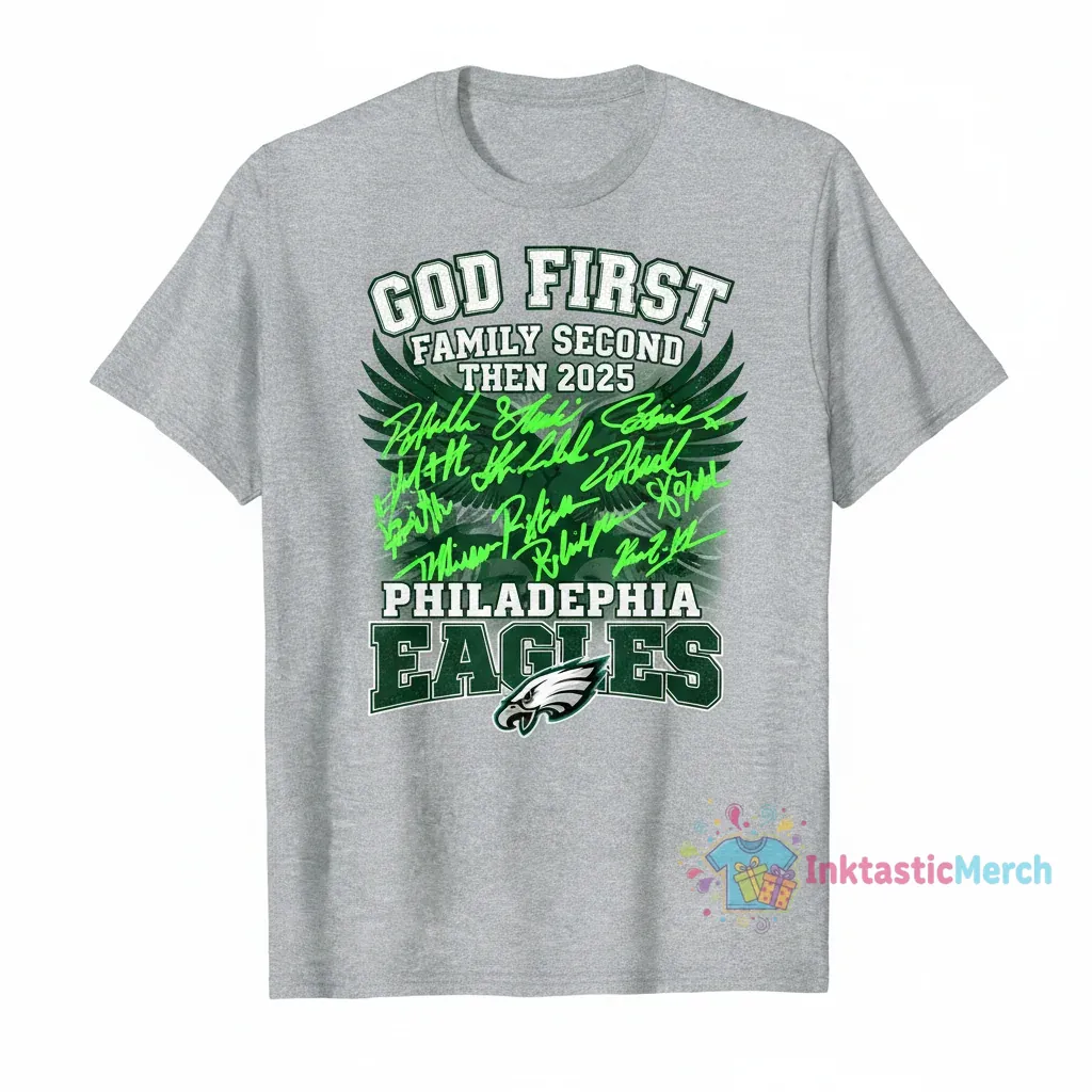 God first, family second, then the spirit of victory! This tee isn’t just apparel; it’s a declaration of what truly matters. Inspired by unwavering faith, unbreakable family bonds, and the electrifying passion of the 2025 Philadelphia Eagles, this design captures the heart of a champion. We wanted to create something that resonates deeply, a wearable reminder of your core values and your connection to the team you love. It’s for the fans who lead with their heart and cheer with their soul, celebrating every win, big or small, as a testament to faith and family.
