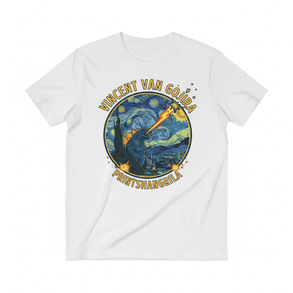 Celebrate the fusion of high art and monster mayhem with this exceptional t-shirt. Featuring a bold, high-resolution print of Godzilla’s destructive presence within the swirling brushstrokes of Van Gogh’s Starry Night, this tee is designed for those who appreciate creativity and a touch of irreverence. It’s an ideal gift for art enthusiasts, Godzilla fans, or anyone looking to add a distinctive, eye-catching item to their wardrobe. The vibrant print ensures the detailed artwork stands out, making it a focal point of any outfit.