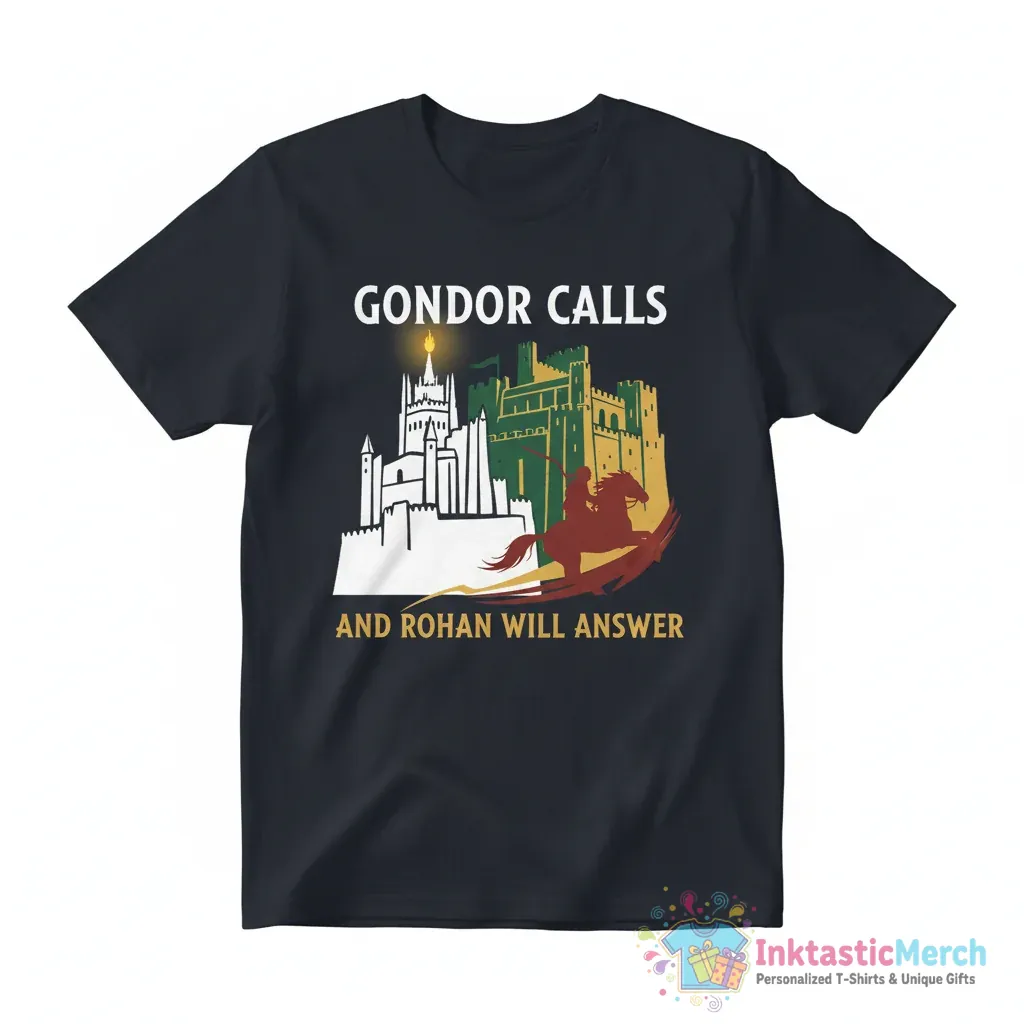 Embrace the spirit of epic fantasy with the Gondor Calls for Aid and Rohan Will Answer T-Shirt. Crafted from ultra-soft, premium quality cotton, this tee offers all-day comfort and durability, featuring a print that stays vibrant wash after wash. As a proud offering from InktasticMerch, this shirt is perfect for fans who want to showcase their admiration for legendary kingdoms and heroic deeds.
