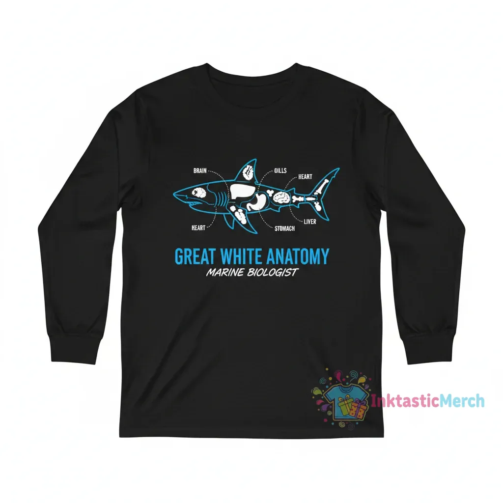 Dive into the fascinating world of marine life with this unique Great White Shark Anatomy T-shirt. Perfect for aspiring oceanographers and shark enthusiasts, this tee showcases a detailed anatomical illustration of the majestic Great White, celebrating the marvels of marine biology. Imagine yourself exploring coastal waters or simply enjoying a day out, all while wearing a piece that sparks conversation and showcases your passion for the ocean’s apex predator. This shirt is more than just apparel; it’s a wearable tribute to the incredible science behind these magnificent creatures.