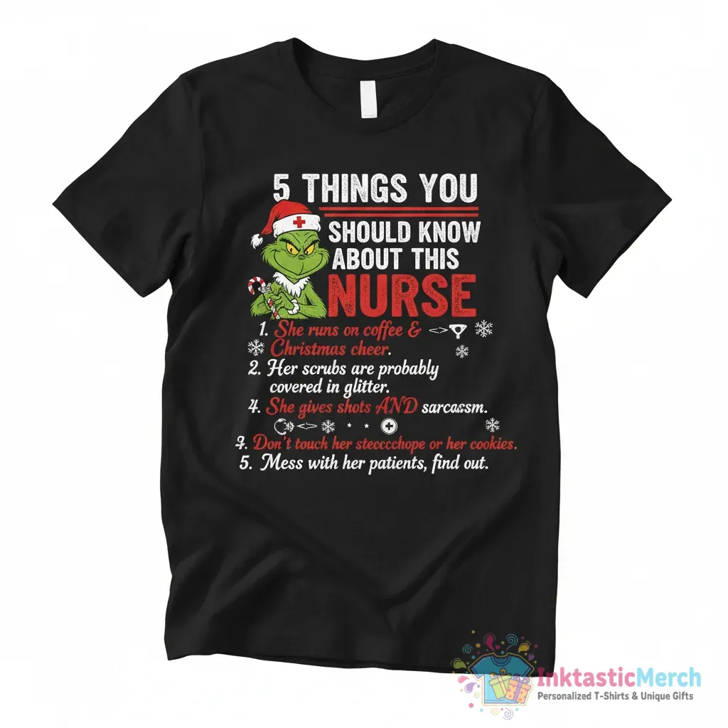 Discover the perfect blend of festive cheer and your nursing passion with this unique Grinch-themed nurse Christmas shirt. Designed for comfort and style, this top proudly displays “5 things you should know about this nurse” in a playful Grinch-inspired design. It’s the ultimate way to show off your holiday spirit and your dedication to caring for others, making it a standout piece for the festive season.