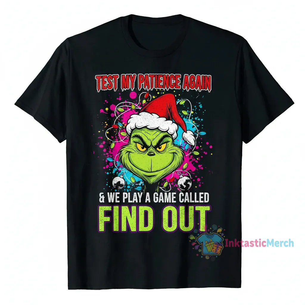 Grinch Christmas 2025, test my patience again and we play a game called ‘Find Out’ – this shirt is for those who embrace the holiday spirit with a dash of playful defiance! Inspired by the iconic Grinch and the joy of the festive season, this design captures the cheeky fun that comes with family gatherings and holiday cheer. It’s a wearable wink to anyone who understands that sometimes, the best way to navigate the holiday hustle is with a bit of humor and a lot of love. This isn’t just a shirt; it’s a conversation starter, a statement of your festive personality, and a reminder to keep the holiday magic alive, even when patience wears thin.