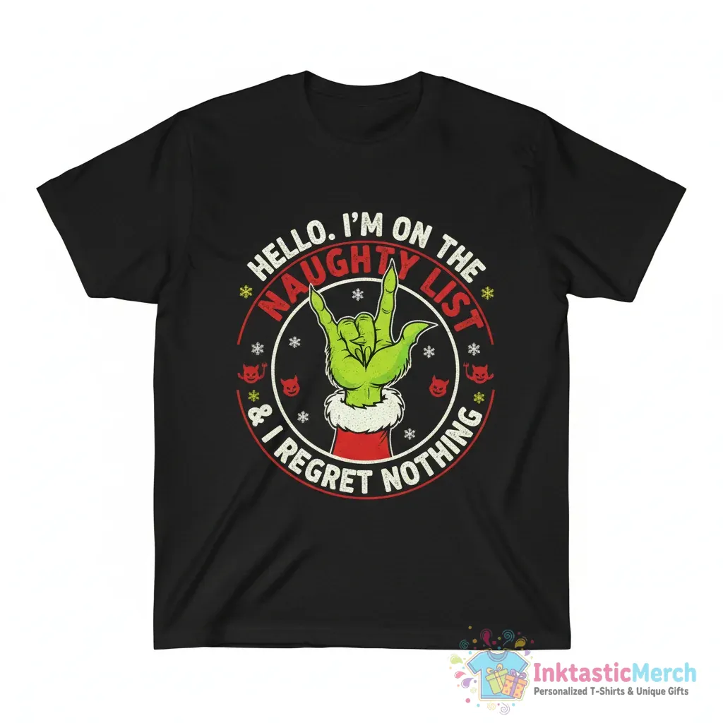 Embrace your inner mischief with this Grinch hand hello on the Naughty list and regret nothing shirt. Crafted from premium quality fabric for incredible softness, this tee brings a fun, slightly rebellious vibe to your wardrobe, perfect for holiday parties or casual wear. Discover more at inktasticmerch.com.