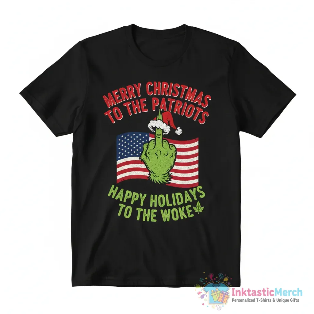Show off your holiday spirit with a rebellious twist in the Grinch Hand Middle Finger Merry Christmas to the Patriots Happy Holidays to the Woke Shirt, crafted from super-soft, high-quality fabric for maximum comfort. This tee is perfect for expressing a bold holiday attitude, and you can discover more unique designs at inktasticmerch.com.