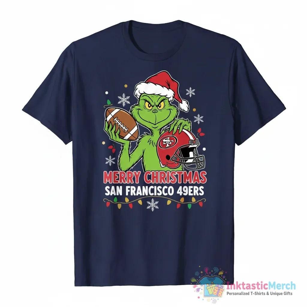 Show your holiday spirit and your team pride with the Grinch holding a football and helmet San Francisco 49ers Merry Christmas shirt from InktasticMerch. Crafted from super-soft, premium quality fabric for all-day comfort, this eye-catching tee is perfect for any 49ers fan who loves the festive season.