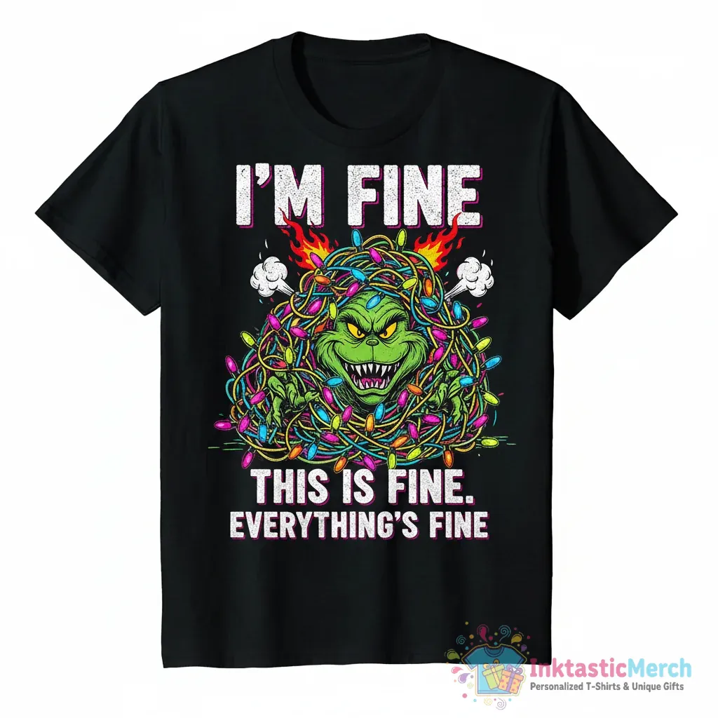 Embrace the holiday spirit with the “Grumpy Grinch Christmas light I’m fine this is fine everything’s fine shirt” from InktasticMerch. Made with premium quality, ultra-soft fabric, this durable tee is designed to last through all your festive adventures while sharing a laugh. Its vibrant print and universally flattering unisex fit make it the perfect blend of humor, comfort, and cheer.