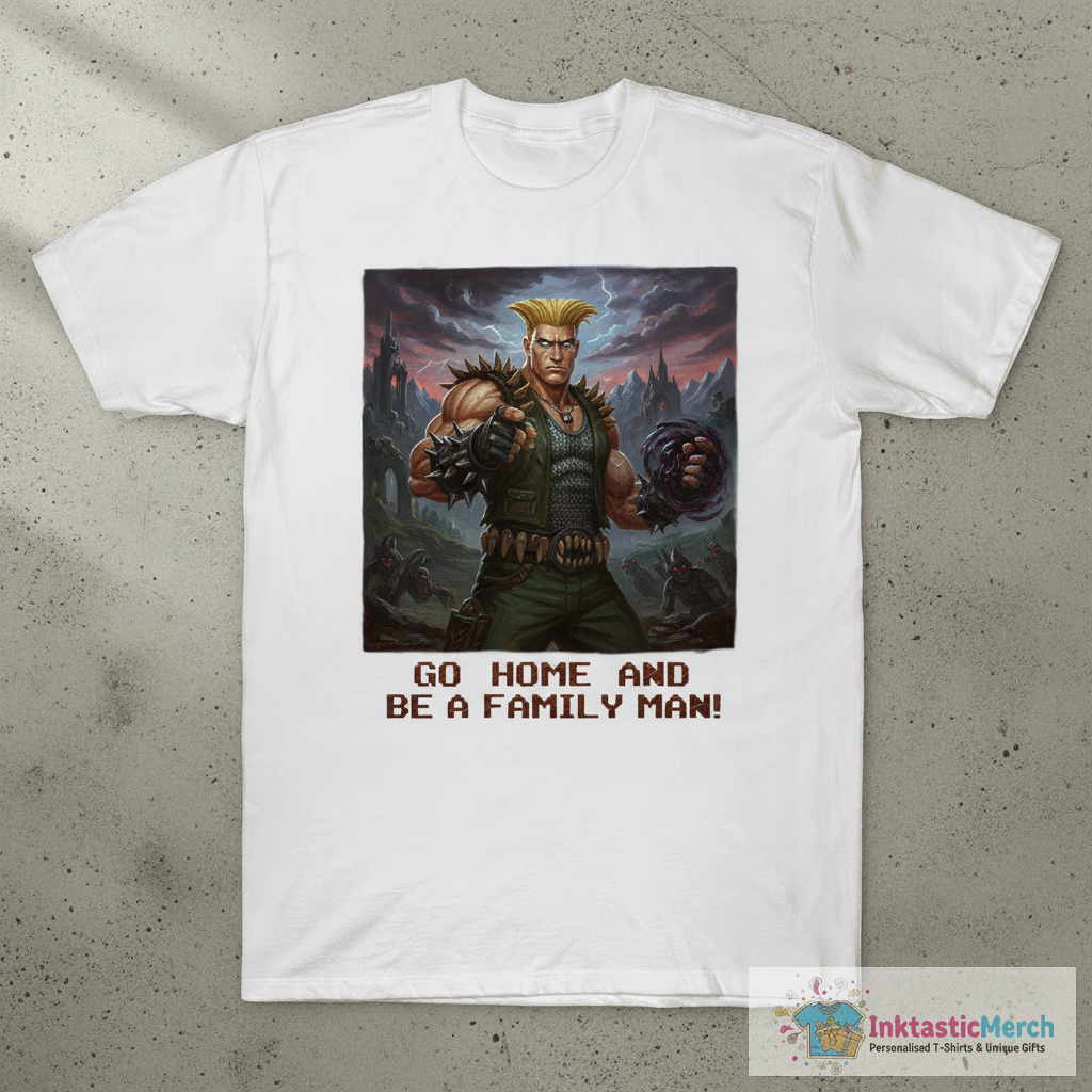 Show your love for a classic fighting game moment with the Guile go home and be a family man shirt. This unique tee captures the iconic line in a fun and stylish way. It’s the perfect way to express your fandom and add a touch of retro gaming flair to your wardrobe. Made for comfort and designed to stand out, this shirt is a must-have for any fan.