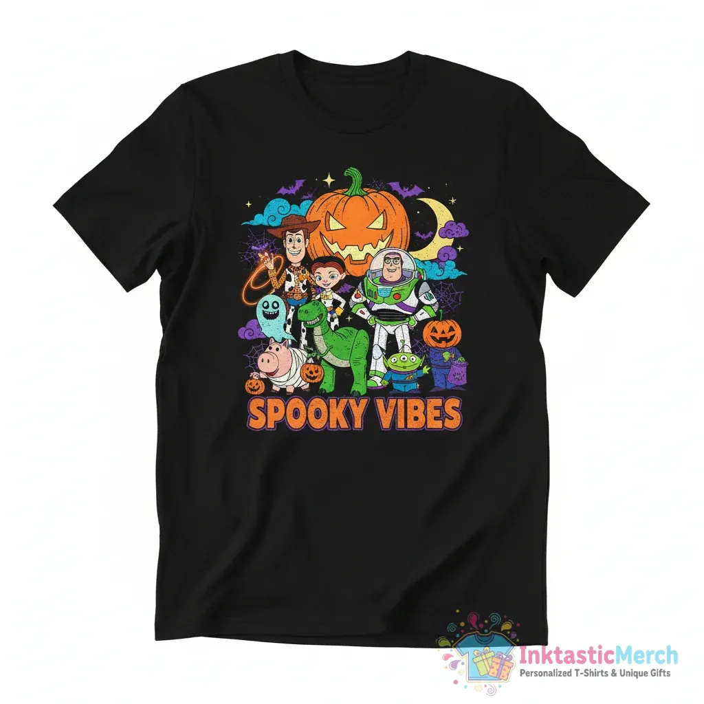 Get into the Halloween spirit with the Halloween Toy Story Characters Spooky Vibes shirt, made from premium quality fabric for both style and comfort. This tee features a unique design capturing the essence of Halloween with a Toy Story twist, offering a super soft feel and top-notch quality that will last for Halloweens to come. You can find this and more at InktasticMerch.