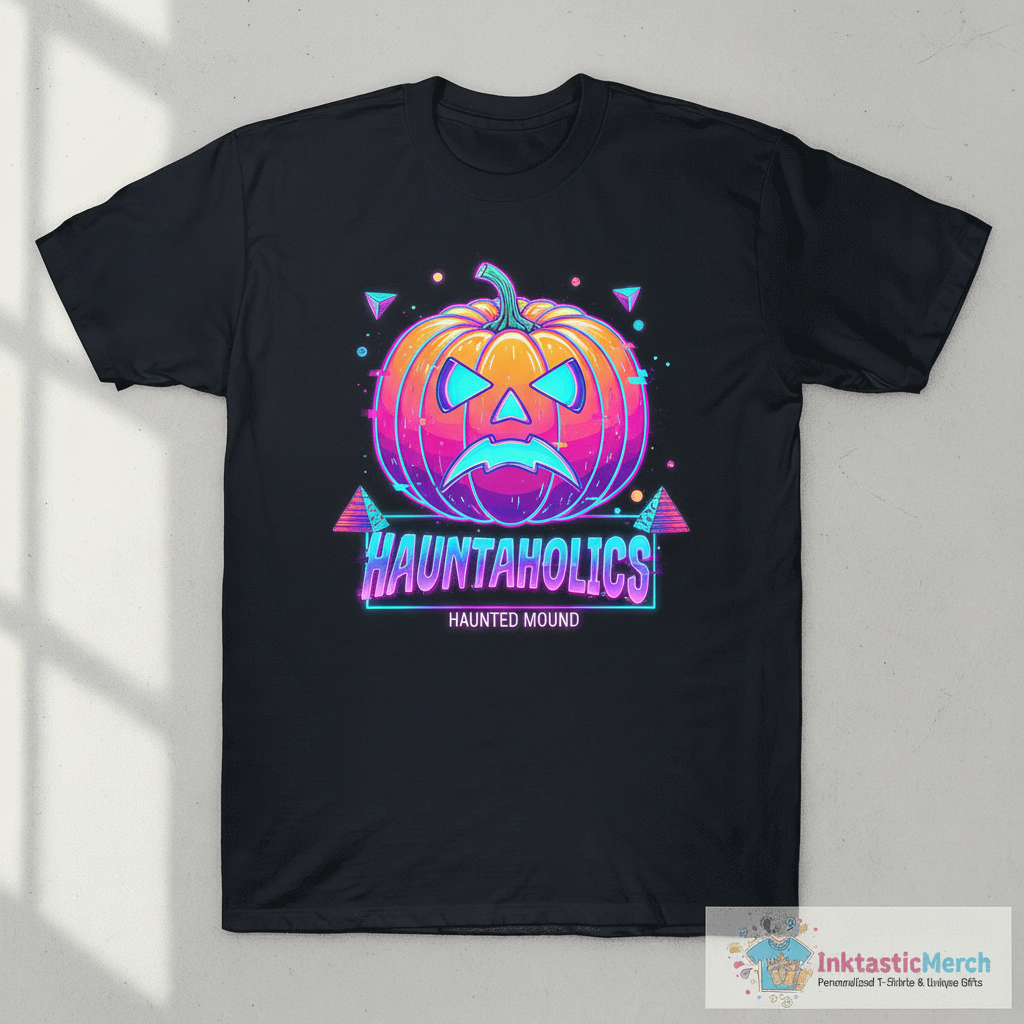 Embrace the spooky season with the Haunted Mound Hauntaholics Pumpkin Halloween T-shirt from InktasticMerch. Designed for comfort and durability with ultra-soft, premium fabric, this tee offers a unique Haunted Mound Hauntaholics design that stands out, perfect for all your fall adventures and Halloween cheer.