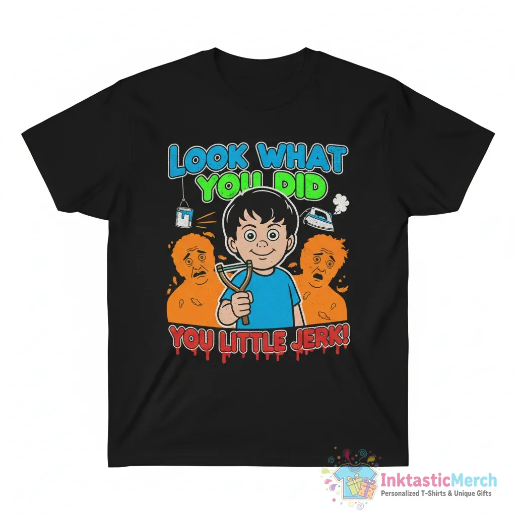 Show off your love for a holiday classic with the Home Alone “Look What You Did You Little Jerk” Shirt. This tee captures a memorable moment from the beloved movie, making it a must-have for any fan, and is crafted from ultra-soft, premium cotton for maximum comfort, available at inktasticmerch.com.