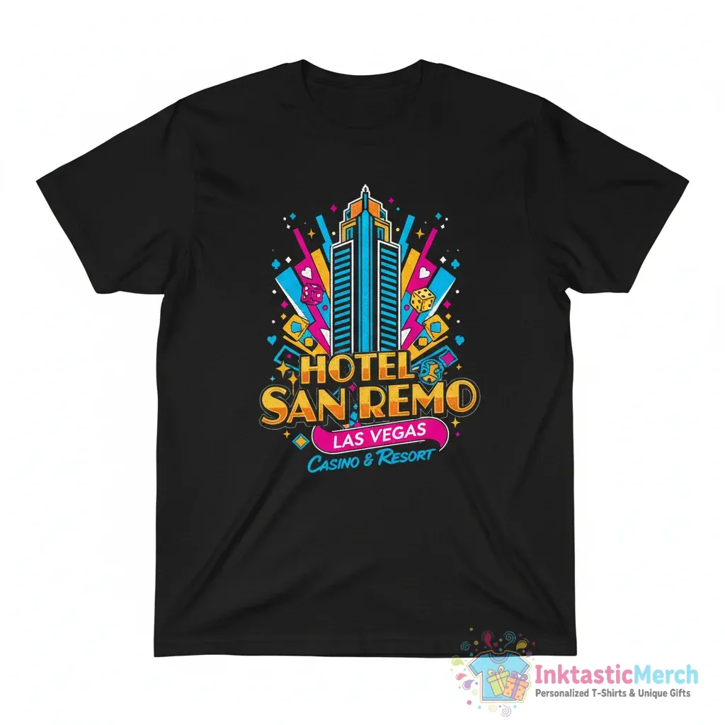 Make a statement with the Hotel San Remo Las Vegas casino and resort shirt from InktasticMerch. This premium quality tee captures the iconic spirit of one of Vegas’s most memorable spots, offering ultimate comfort and style with its uniquely designed, ultra-soft, breathable fabric. It’s a wearable piece of Las Vegas nostalgia, perfect for reliving good times or dreaming of your next trip.