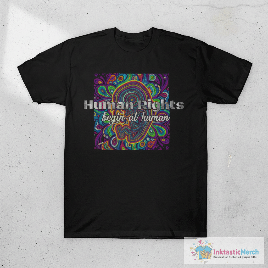 Make a powerful statement with the Human Rights Begin at Human T-Shirt from InktasticMerch, designed for both comfort and conscience. Crafted from ultra-soft, breathable cotton, this shirt offers exceptional comfort for everyday wear while boldly displaying a meaningful message about equality and justice. Its high-quality, durable fabric ensures it holds its shape and color, making it a versatile and impactful addition to your wardrobe.