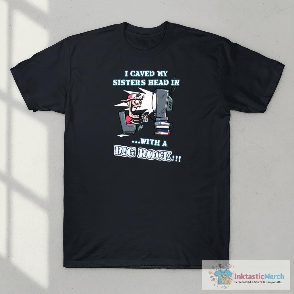 Bring your style to life with the I caved my sisters head in with a big rock shirt today!