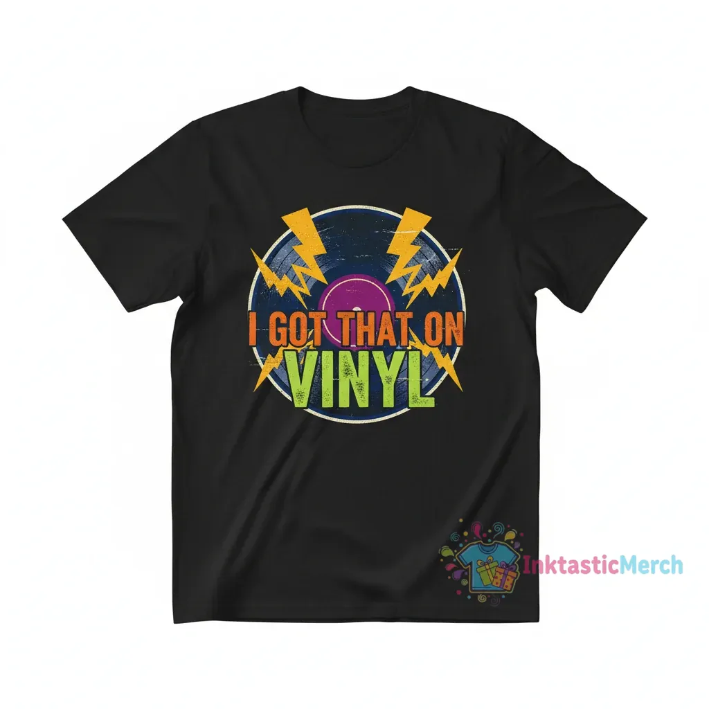 - Unique “I got that on vinyl” graphic with clean white lettering